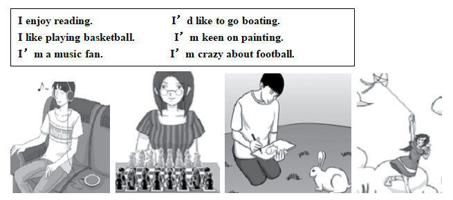 任务一:张庆班上要进行一次兴趣爱好的调查,假设你是张庆去采访你们的同学,可借助以下句型或图片。