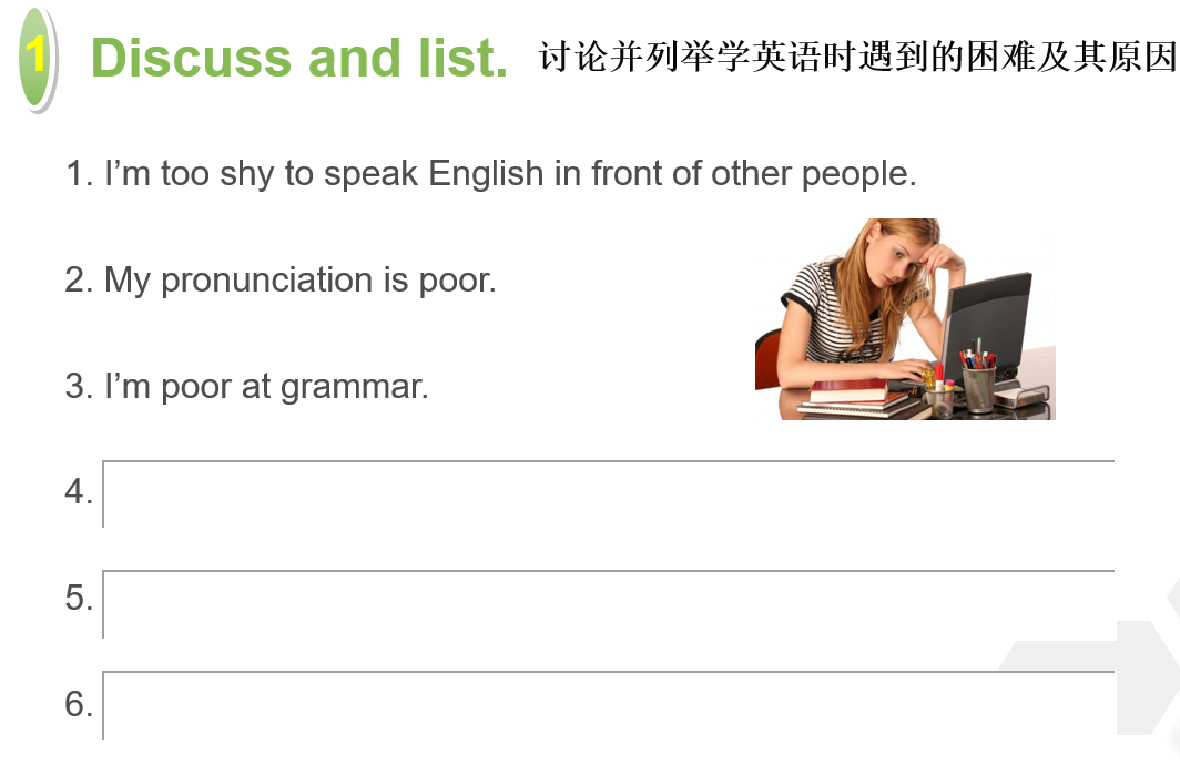 任务一:讨论并列举学英语时遇到的困难及其原因