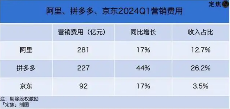 阿里在营销上花钱最多,本季度比去年同期多花了40亿元;