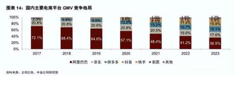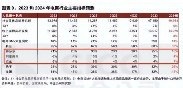 根据中金公司研报中电商平台的GMV增速和格局变化,「定焦」计算出三家2023年的GMV体量大致为,阿里8万亿、拼多多3.7万亿、京东3.6万亿。