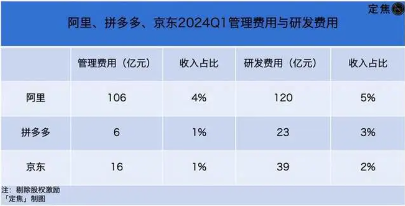 从剔出股权激励的费用来看,阿里、京东和拼多多一致是对外适当花、对内拼命省。