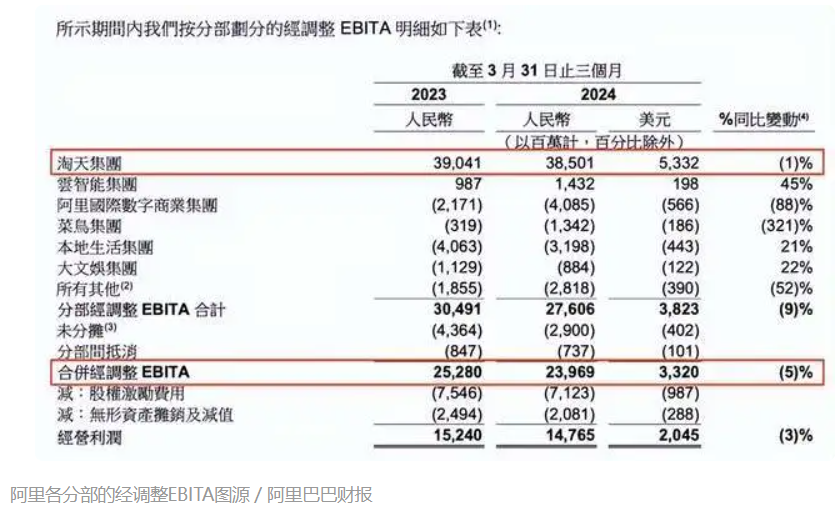 淘天的客户管理收入只增长了5%,这与平台降低对阿里各分部的经调整EBITA图源 / 阿里巴巴财报