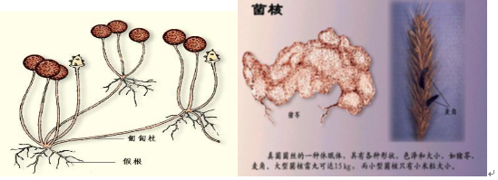 4)菌核:是一种休眠的菌丝组织。由菌丝密集地交织在一起,其外层坚硬、色深,内层疏松,颜色较淡。