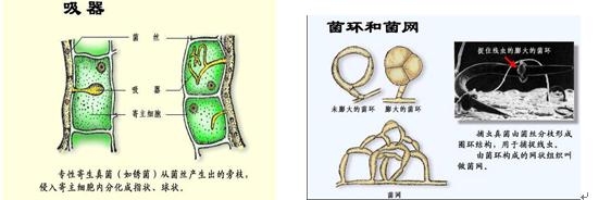 2)菌环和菌网:某些捕食性真菌菌丝会形成环状或网状等变态物结构,前者称做菌环,后者称做菌网。功能:套捕其它小生物。