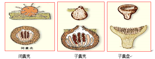 子囊果:在子囊和子囊孢子发育过程中,雄器和雌器下面的细胞生出许多菌丝,形成保护组织,整个结构成为一子实体。这种有性的子实体称为子囊果,子囊包在其中。