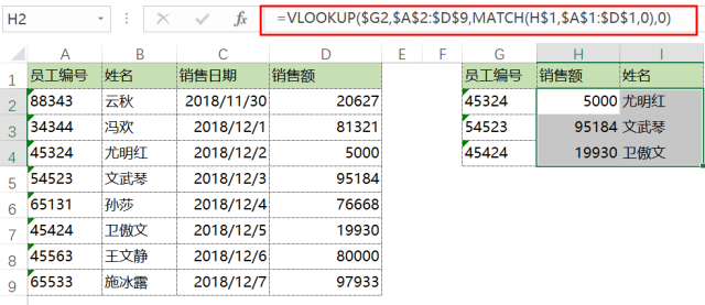 查找姓名对应的销售额。在F3单元格中输入公式