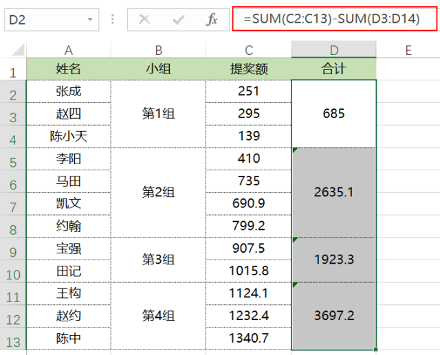 选中D2:D13单元格区域,然后在公式编辑栏里输入公式:=SUM(C2:C13)-SUM(D3:D14),然后按<Ctrl+Enter>完成,如下图所示: