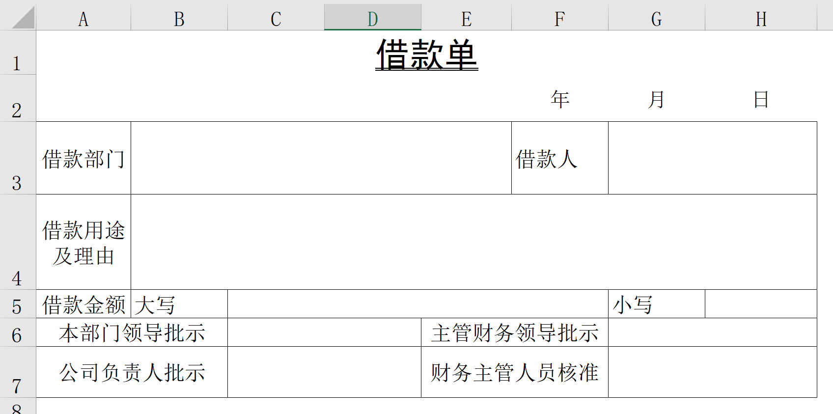 2019年12月12日销售部员工薛玉洁和苏娜从石家庄到武汉出差参加经销商大会,12月15日回到石家庄,出差前预借差旅费4000元。公司规定,往返交通工具费用实报实销,住宿标准每人每天不高于200元,市内交通补助实报实销,误餐补贴每人每天60元。请用Excel制作一个空白借款单,并根据例题信息,将借款单填写完毕。