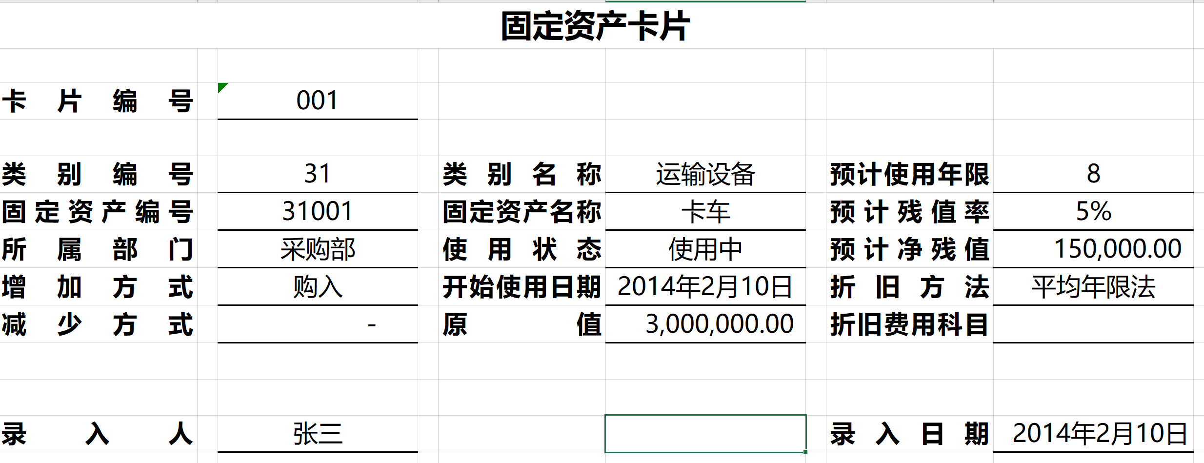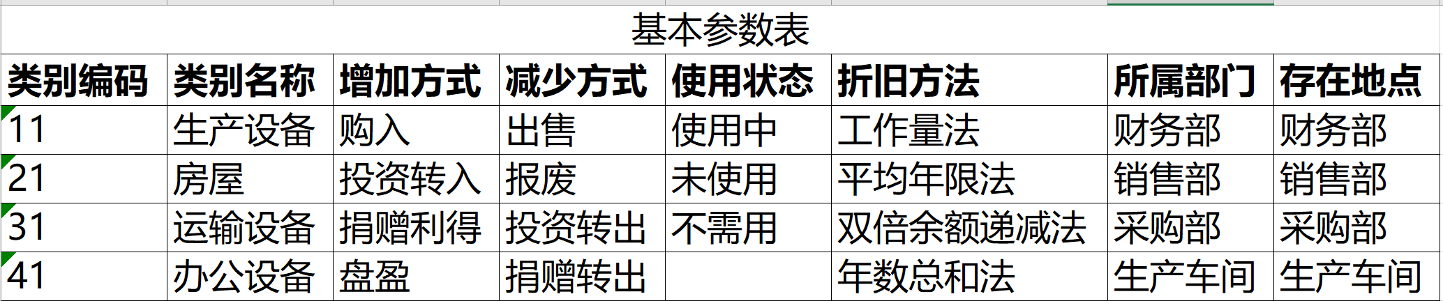 打开“固定资产管理”,将SHEET1重命名为“基本参数表”,并按照下图进行输入录入;