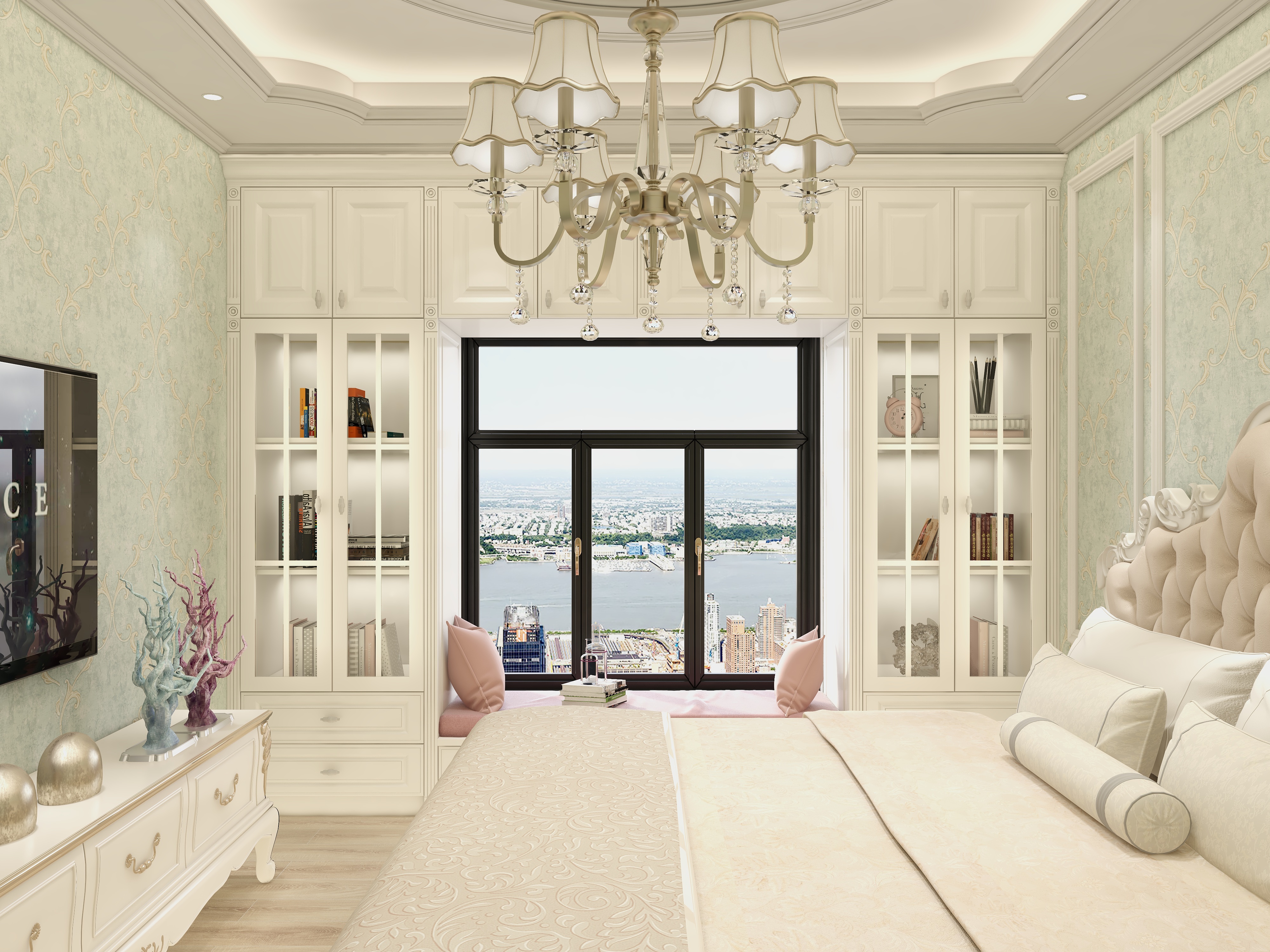 欧式风格飘窗柜设计,扫码看全景漫游图。