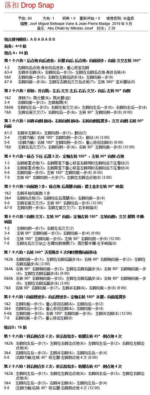 《落扣》是街舞风格的中高级排舞,分A、B两个组合,A组合有8个八拍,B组合有2个八拍,整曲的组合顺序是:A+B+A+B+A+B+B,无间奏和重启。手部动作含响指,其他手部动作可以自由发挥。