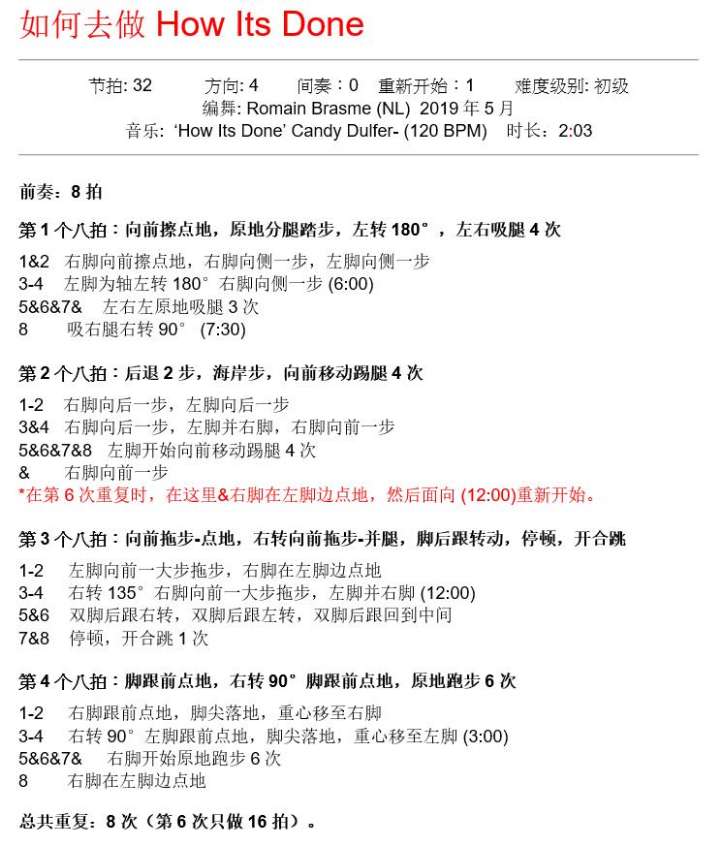 《如何去做》是街舞风格的初级排舞,所涉及的排舞专门步伐不多,比较适合初学者学习。舞蹈一遍结束后面对3点方向,所以完成全方向需要连续跳四遍。为了初学者方便,本课程去掉了间奏和重启,因此音乐设置成完整练习七遍的长度和节拍数。手部动作可以自由发挥。