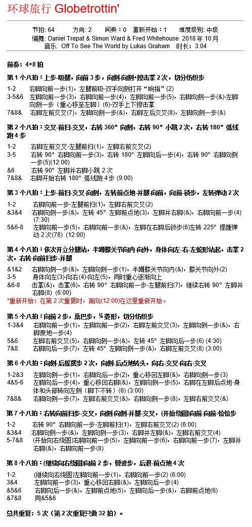 《环球旅行》是爵士风格的中级排舞,总共8个八拍。一遍完成后面对6点方向,因此完成全方向需要跳两遍。音乐长度为4.5遍动作,无间奏,有1次重启,第二遍重复时只做4个八拍然后重新开始。手部动作可以自由发挥。