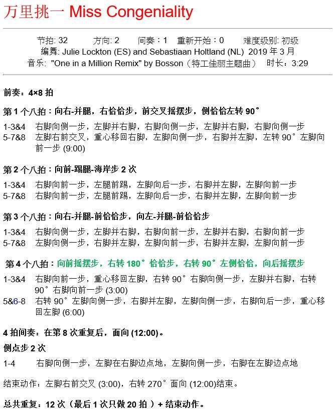 《万里挑一》是初级排舞动作,总共4个8拍。一遍完成后面对6点方向,因此完成全方向需要跳两遍。为了方便初学者,本课程提供剪辑版音乐,去掉了间奏和重启,音乐长度为7遍动作。手部动作可以自由发挥。