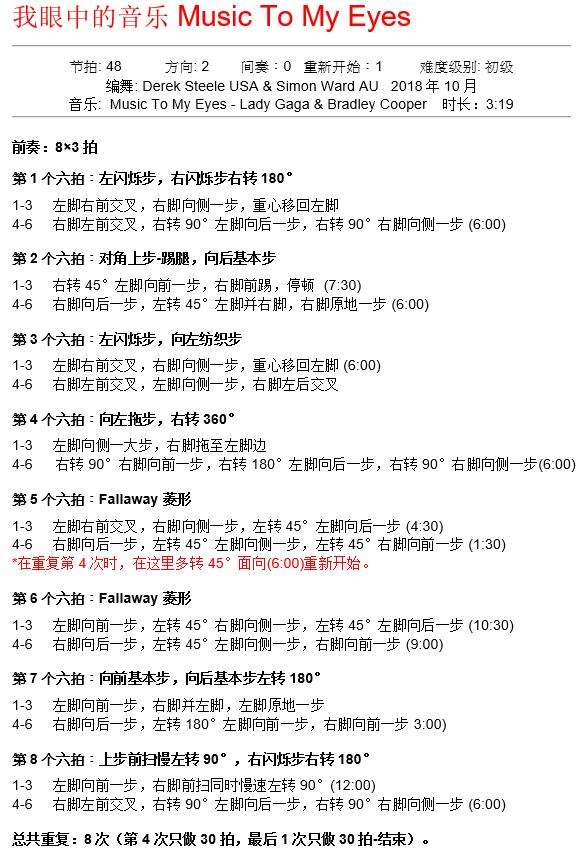 《我眼中的音乐》是华尔兹风格的初级排舞,总共8个六拍。一遍完成后面对6点方向,因此完成全方向需要跳两遍。原版音乐比较复杂,有一次重启,所以本课程提供了剪辑版音乐,长度为5遍完整动作。手部动作可以自由发挥。