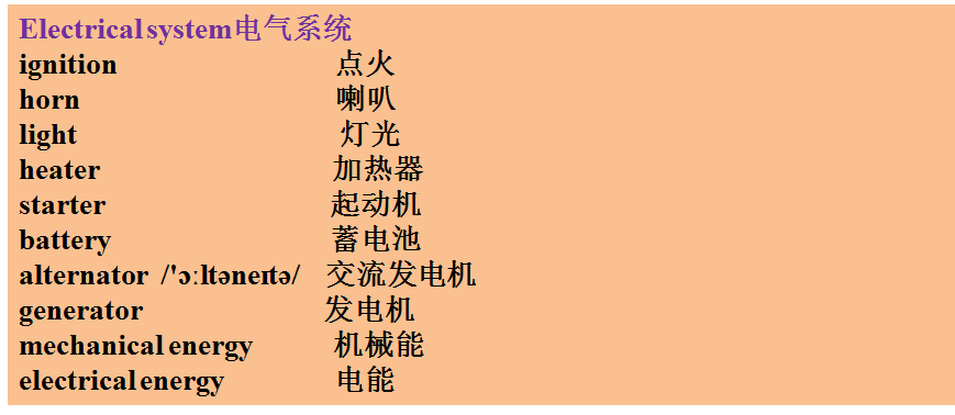 The electrical system supplies electricity for the ignition, horn, lights, heater,and starter. The electricity level is maintained by a charging circuit. Thiscircuit consists of the battery, alternator (or generator). The battery stores electricity.The alternator changes the engine’s mechanical energy into electrical energy andrecharges the battery.
