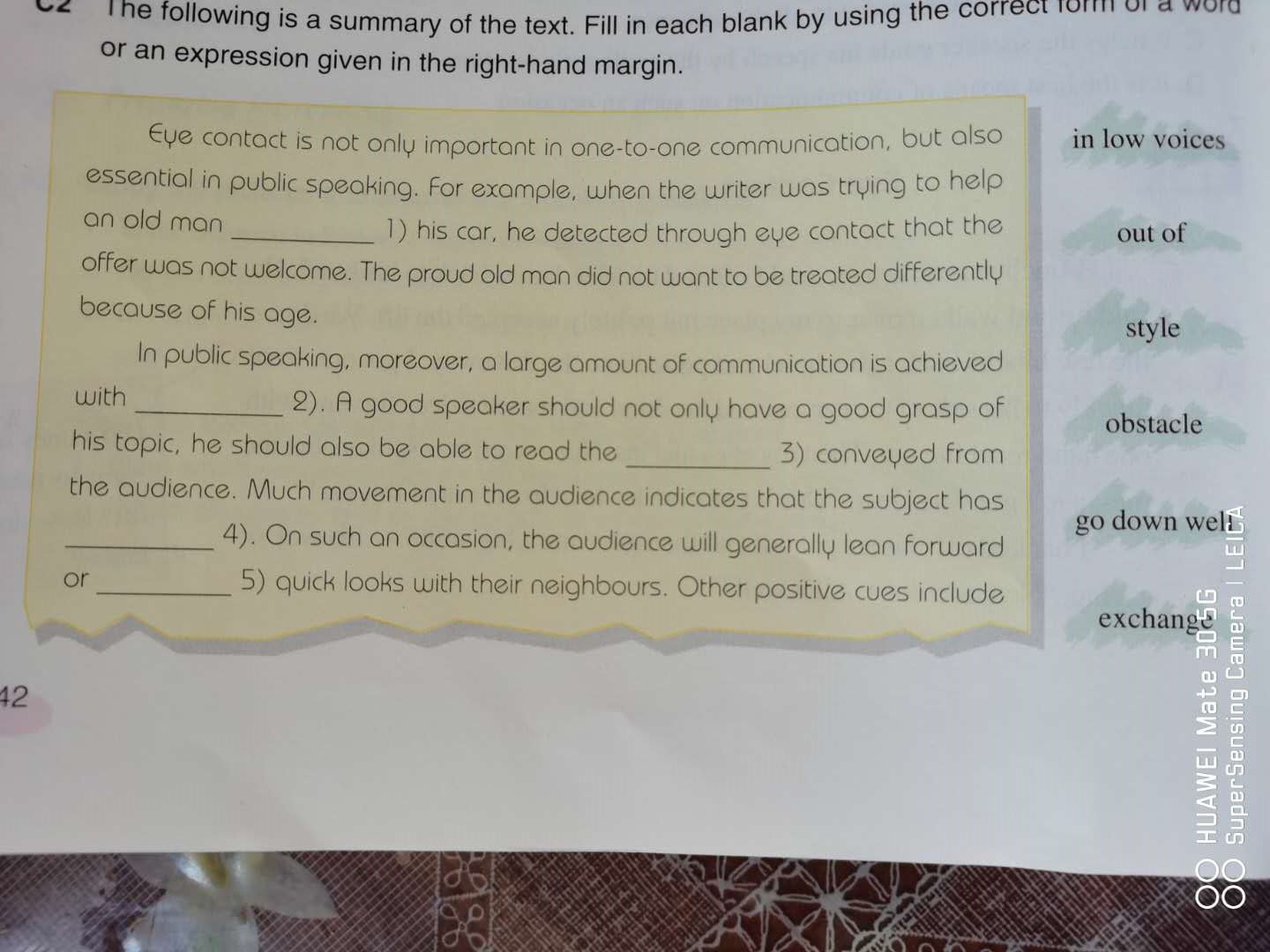 in low voices 2. out of 3. style 4. obstacle 5.go down well