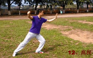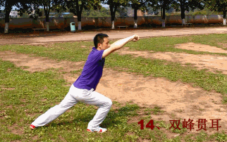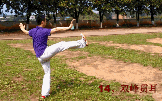 一、动作名称: 12、高探马--13、右蹬脚--14、双峰贯耳--15、转身左蹬脚