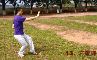 (3)两臂左右划弧分开平举,肘部微屈,手心均向外;同时右腿屈膝担起,右脚向右前方慢慢蹬出;眼看右手。