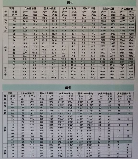 另外,各个测试项目都设置了具体的标准,比如,50米短跑,大一、大二的学生,男生超过9.1秒就为不及格,女生超过10.3秒为不及格;大三、大四的学生,男生超过9.0秒则不及格,女生超过10.2秒为不及格。