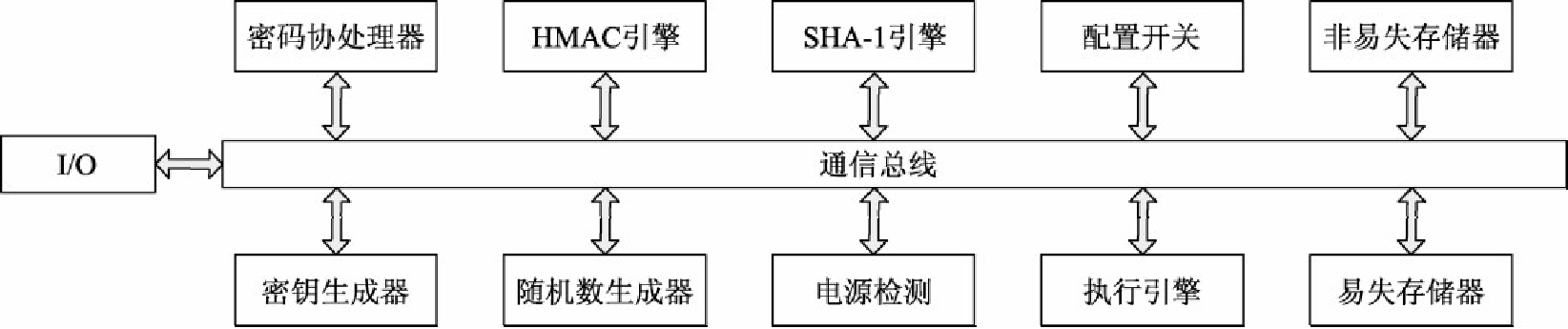 TCG 定义的 TPM 作为可信计算平台的信任根,包括 I/O、密码协处理器、散列消息认证码(Hash-based Message Authentication Code,HMAC)引擎、SHA-1 引擎、随机数生成器、执行引擎、存储器等组件。如下图所示: