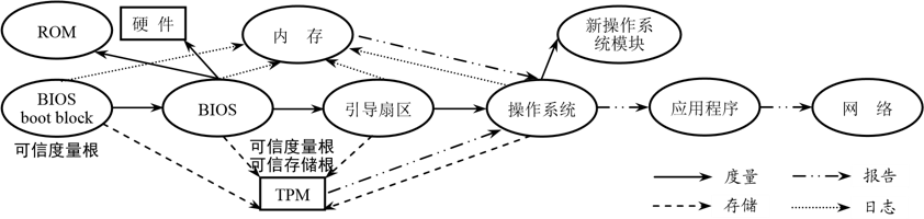 信任链技术是可信计算的关键技术之一,是信任度量模型的实施方案。在实现 TCG 可信计算的度量、存储和报告 3 大基本功能中,度量功能具有核心基础地位,而实现度量功能的正是信任链理论和技术。
