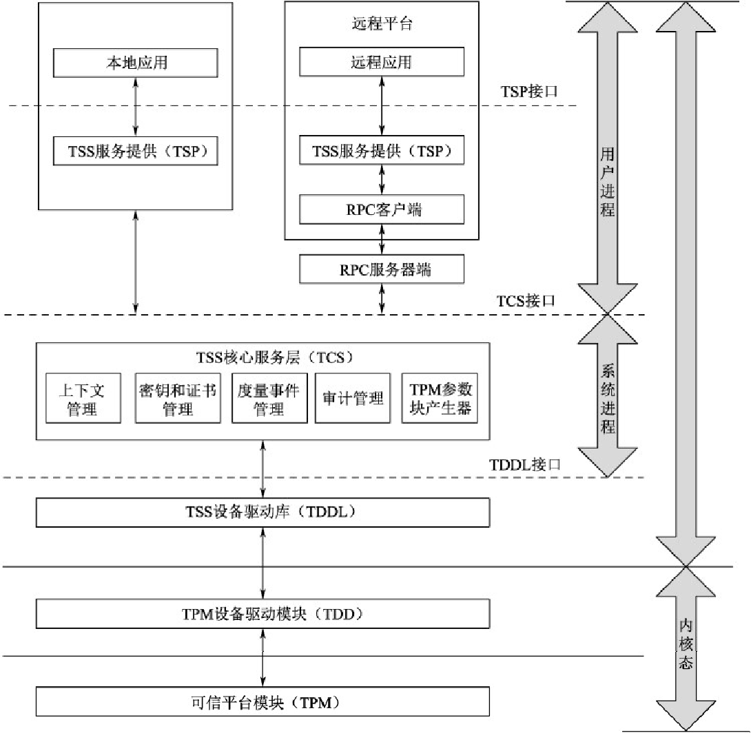 可信软件栈(TCG Software Stack,简称TSS)又称为 TCG 软件栈,它是可信计算平台上 TPM 的支撑软件,处在 TPM 之上、应用程序之下,主要为操作系统和应用软件提供使用 TPM 的接口,同时实现 TPM 的管理。