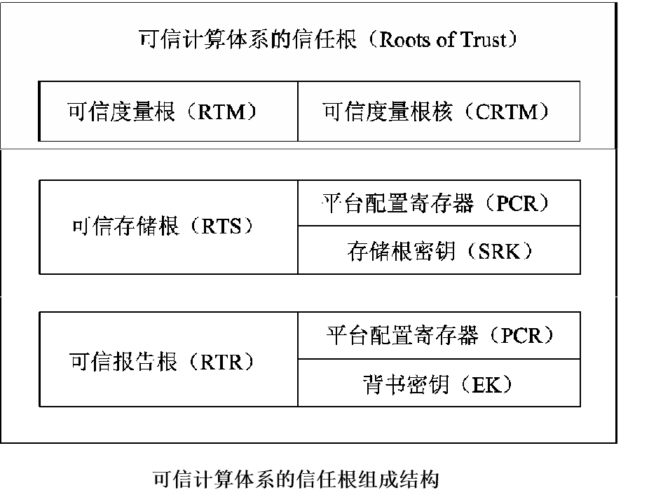 可信系统需要一种机制来确保自身可信并向外界提供可信服务,这种机制就是可信度量存储报告机制,其功能是:对计算平台进行度量,对度量的可信性进行存储,当访问客体询问时提供报告。与此对应,可信系统的信任根通常有 3 个: