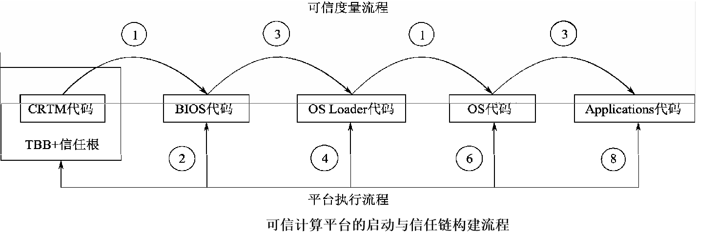 前面在信任链构建部分已经讲述了可信 PC 的安全启动过程,从 BIOS 启动块→BIOS→引导扇区→操作系统构成了一个串行信任链,其中 基本的要素就是可信根。
