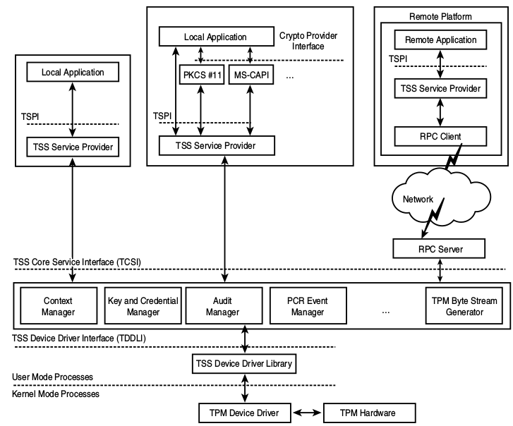 也就是说,不同的应用程序和操作系统并不能直接访问 TPM,而是通过调用 TSS 接口来方便地使用 TPM 提供的可信计算功能。TSS 的设计目标为:为应用程序到 TPM 提供正确的入口点,为应用程序到 TPM 提供层次化访问模式,提供对 TPM 的同步访问,向应用程序隐藏 TPM 所建立的功能命令,正确管理TPM 资源。