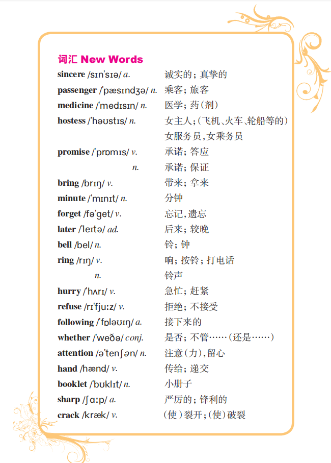 2. In the following hours of flight, each time the air hostess passed by the passenger, she would ask him with a smile whether he needed help or not... 在接下来几个小时的飞行中,空姐每次经过这位乘客时都会微笑着问他是否有什么需要……