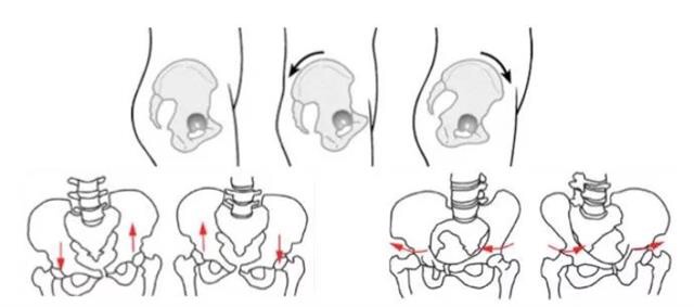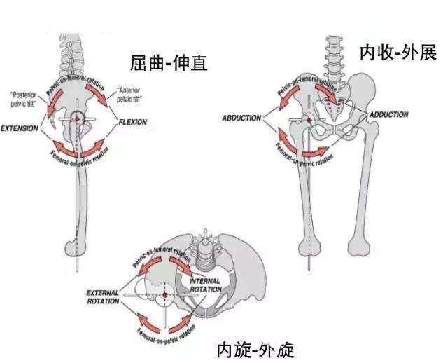 骨盆是连接躯干和下肢的纽带,通过腰骶关节和腰椎相连,通过髋关节和下肢相连,故骨盆可以这些关节为轴,作向前和向后的转动(如腹背运动的体前屈和体后伸),绕一侧髋关节的垂直轴,作左右转动(如竞走增加步幅运动)。绕一侧髋关节的矢状轴,可做向上向下运动(如上下楼梯动作)。绕腰骶关节三个轴,骨盆和下肢一起对脊柱运动。绕腰骶关节额状轴作前屈(如仰卧举腿),后伸(后手翻动作)。绕矢状轴作侧屈(如鞍马的单腿摆越动作),绕垂直轴作回旋(如双杠前摆转体180°)等运动。应该指出,骨盆的运动常常是在一侧髋关节和腰骶关节处同时进行的。也总是和下肢及躯干的运动联系起来的。这样,可使它们的运动幅度得到调节或补充。