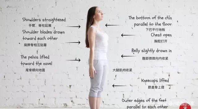 双脚并拢(初学者双脚打开与肩同宽)脚外侧与垫面平行;大腿肌肉收紧,膝盖骨一条直线向上提;大腿前侧向后推,尾骨向下沉;重心移到脚后跟,身体的重量均匀分布在双脚上;伸直脊柱,胸腔上提;肩外侧(三角肌前侧)向后推,肩胛骨向下,肩向两个轮子一样,由前侧向后转;手臂沿身体两侧伸直向下,与髋部在一条直线,保持颈部、头部伸直,目视前方。