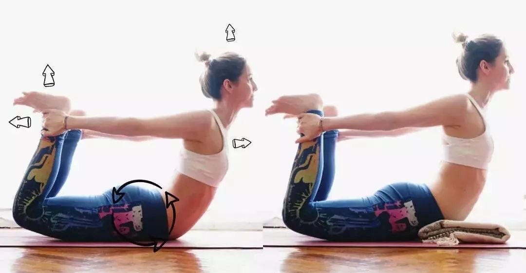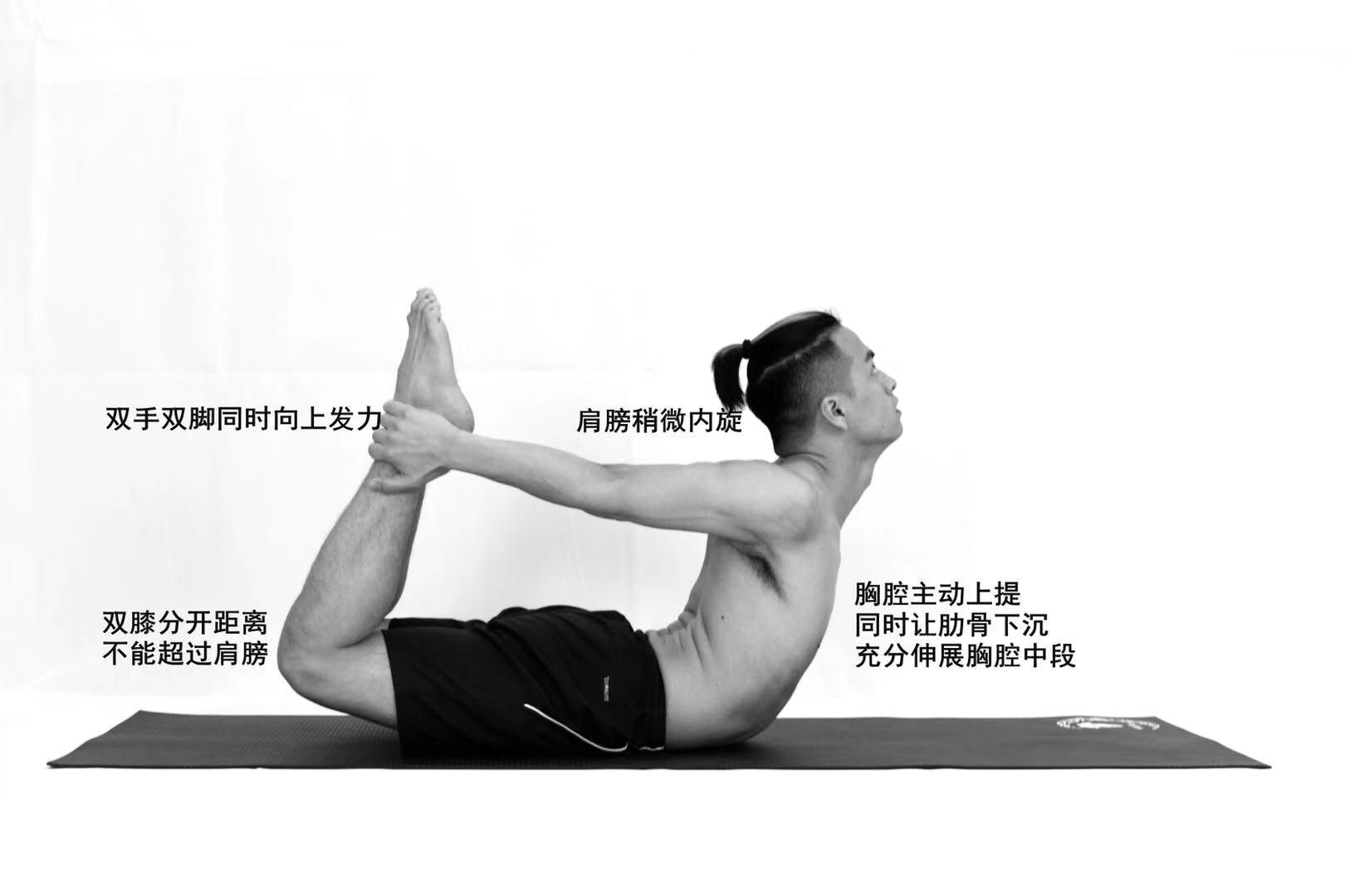 弓式属于后弯体式,和蝗虫式有相似之处,这个体式是从古代武器弓箭演化来的,我们知道弓箭是有韧性的,拉满的弓式圆润而有弹性的,这就需要我们的背部好比弓一样的性能。这个体式做的不对会挤压背部,让腰椎和肩部受伤。因此在练习中要把握一个度,僵硬者借助瑜伽带辅助。也可以先练习简单的弓式(如图A)