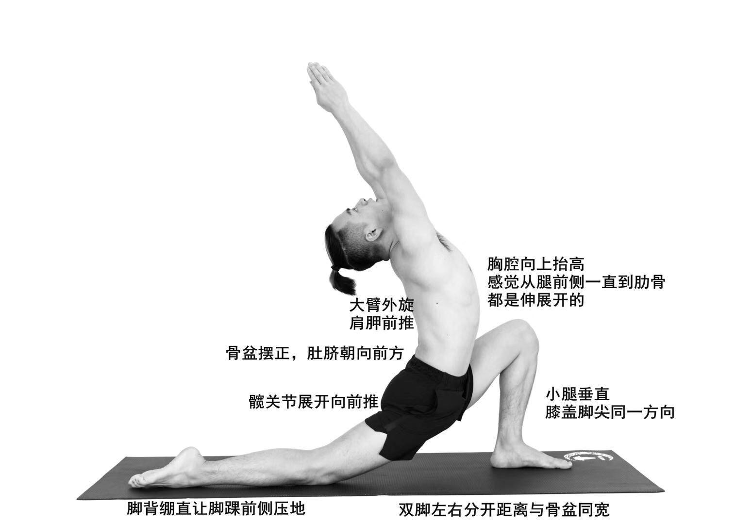 2 右腿成弓部向前,拉伸左臀部。头部向前运动,脊椎拉伸,两肩胛骨下沉。保持这一姿势。