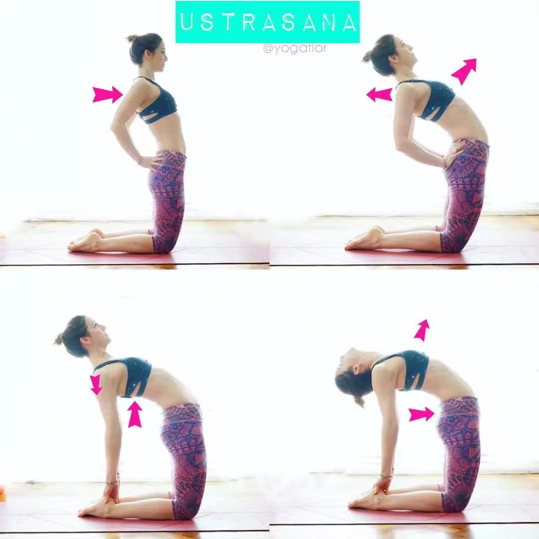 骆驼式是教授给初学者的唯一一个反重力提升脊柱脊柱肌肉的后弯曲体式,在练习过程中,不断地打开习练者的胸部、肩部、大腿前侧以及髋关节。注意在习练时减少对膝盖的压力,腰部不要有强烈的弯曲感和挤压感。初学者建议可以靠墙练习。