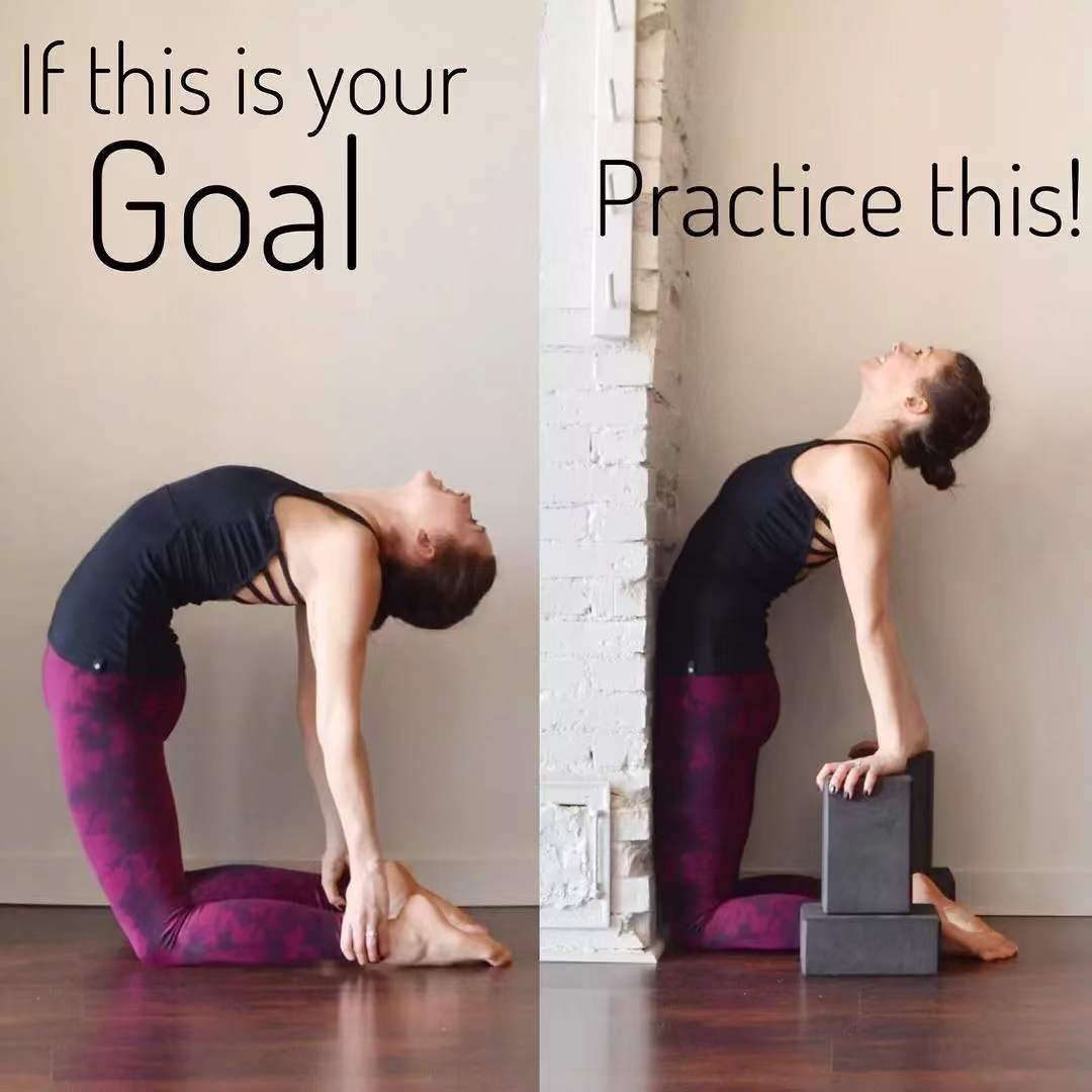 补充:初学者骆驼式双手抓不到脚,可以借助墙壁和瑜伽砖