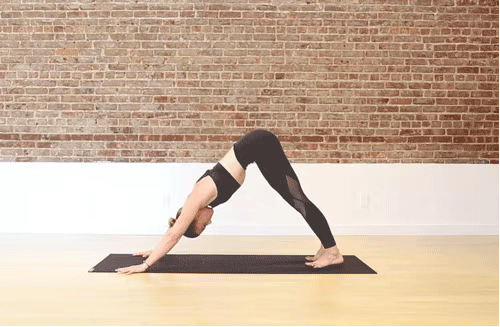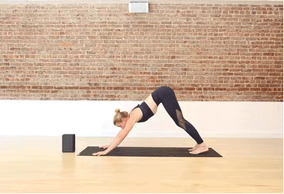 ·呼气,双手放在左脚两侧,左脚向后一大步,双脚并拢,进入下犬式,停留5个呼吸