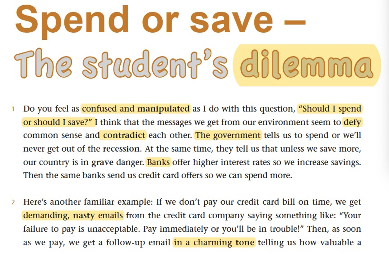 Para.1开门见山地提出了“should I spend or should I save?”的问题,并分别举例说明政府和银行是如何向我们传达这两种截然相反的观点。Para.2用“demanding, nasty emails…failure…unacceptable” VS “in a charming tone…valuable…encouraging”, 以及“a failing consumer in trouble” VS “a valued customer” 这两组意义相对的词汇进一步举例说明银行如何区别对待借贷者和消费者。Para.3则通过subject-to-subject这种文章组织形式对比了广告营销和传统家庭/学校教育之间两种不同的消费观念(the “permissive” perspective VS an “upright” message),为后文讨论这种悖论(paradox)对人们造成的心理影响做好铺垫。