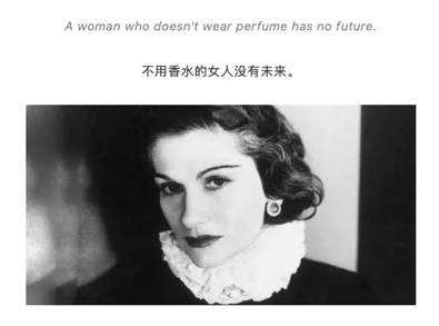 • A woman who doesn’t wear perfume has no future. 不用香水的女人没有未来。(香奈儿)