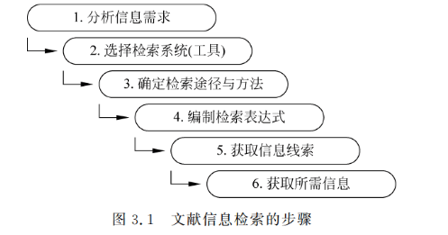 文献信息检索是一项实践性很强的活动,它要求检索人员善于思考,并通过经常性的实践,逐步掌握文献检索的规律,从而迅速、准确地获得所需文献。一般说来,文献信息检索的基本步骤包括以下几步:分析信息需求、选择检索系统(工具)、确定检索途径与方法、编制检索表达式、获取信息线索、获取所需信息。如图3.1所示为文献信息检索的步骤。