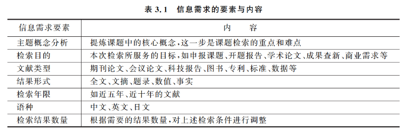 在检索前,要周密地分析信息需求,主要是根据用户的表达,明确本次信息检索的主要内容、所涉及的学科范围及所需信息的文献类型、语种、地区、时间等方面的要求。分析信息需求的目的在于理清检索的基本思路,明确检索的目的、要求与检索范围,并从检索需求中发掘检索的已知条件。一般来说,分析信息需求时可以参照表3.1中的要素进行逐一明确。
