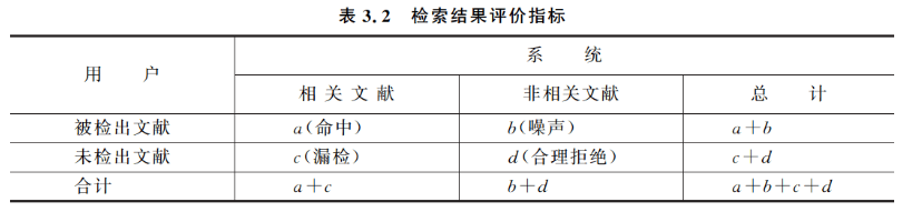 根据F.W.Lancaster的阐述,判定一个检索系统的优劣,主要从质量、费用和时间三个方面来衡量。因此,对计算机信息检索的效果评价也应该从这三个方面进行考量。质量标准主要通过查全率与查准率进行评价;费用标准即检索费用,是指用户为检索课题所投入的费用;时间标准是指花费的时间,包括检索准备时间、检索过程时间、获取文献时间等。在这三个方面中,查全率和查准率是评价检索效果的主要指标,也是用户在实际检索时最关心的问题。下面对目前采用最为普遍的检索效果量化评价指标——查全率、查准率、漏检率、误检率进行简单介绍。通常使用2×2表格对这4个指标进行描述,如表3.2所示。