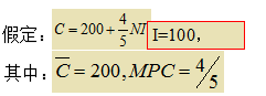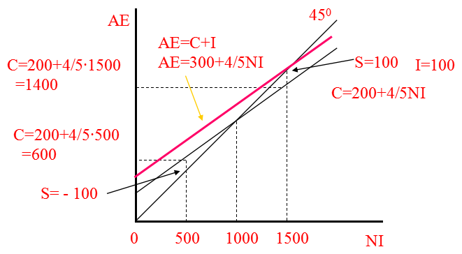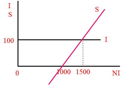 投资是一个常数100;根据上图当国民收入 NI=1000 时,储蓄S=0,当NI=1500 时,S=100;
