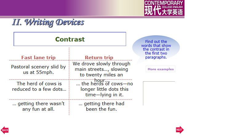 Comparison–contrast is a way of developing an essay. It means explaining thesimilarities and/or differences between events, people, ideas, etc. In this essay, thewriter concentrates on differences rather than similarities. In the first two paragraphs,she contrasts her featureless driving on fast roads and the pleasure of the return trip ona different route. In Paragraph 4, she points out how Americans’ lifestyle has changedfrom “saving for a rainy day” to “relax now, pay later”, and what they did in the pastwhen they wanted to lose weight, and how they try to get quick results today.