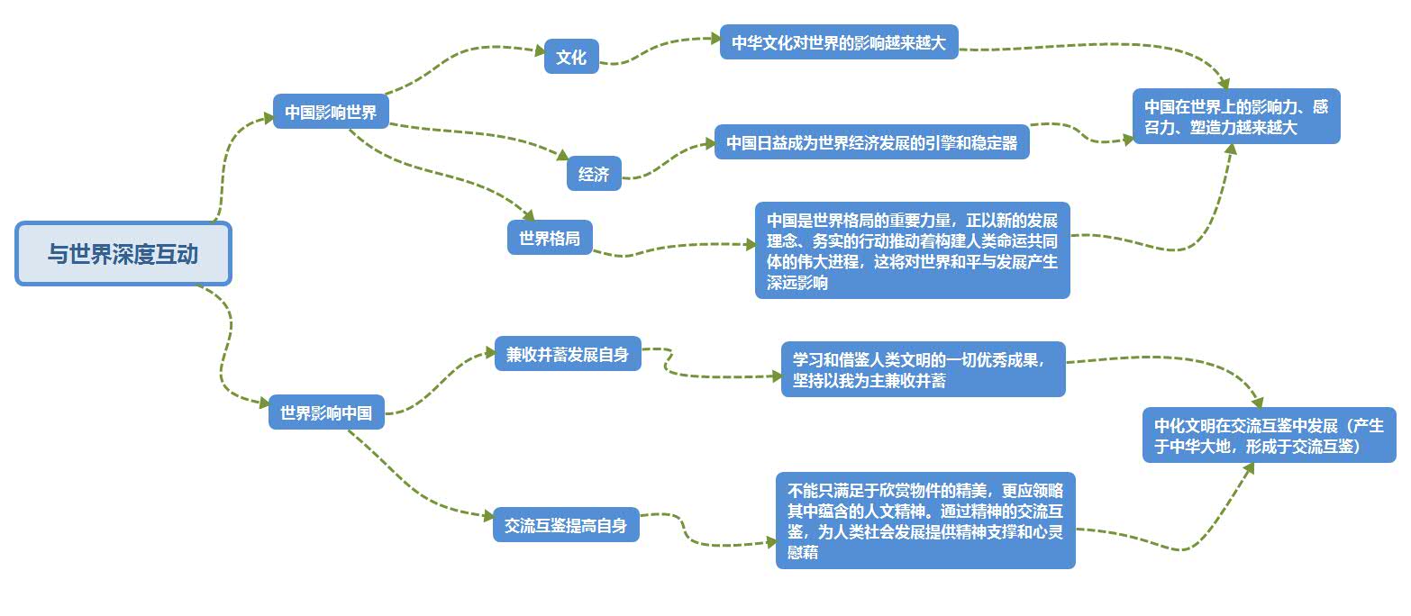 “与世界深度互动”重点讲述 ①中国对世界的影响的表现;②世界上其他国家的发展对中国发展的意义。目的在于引导学生学会以全球视野和辩证眼光看待中国发展与世界的关系;认同中国发展与世界发展紧密相联;认同中华文化,增强国家认同感;增强国际合作意识;增强为世界和平与发展作出努力和贡献的意识。