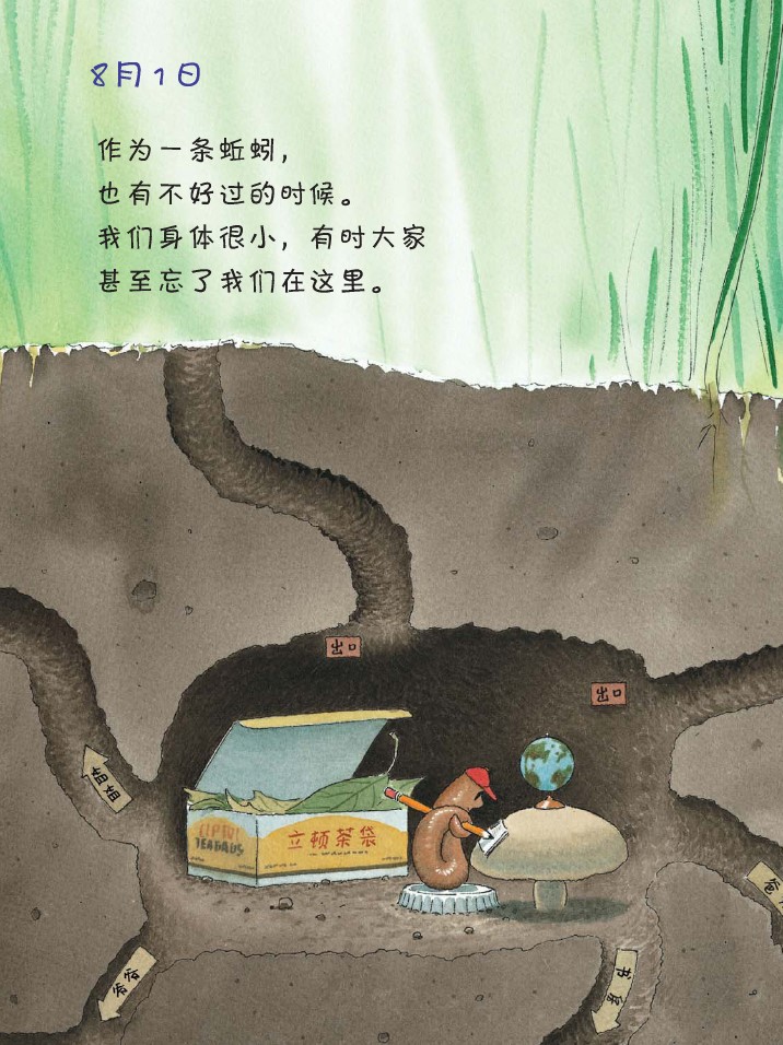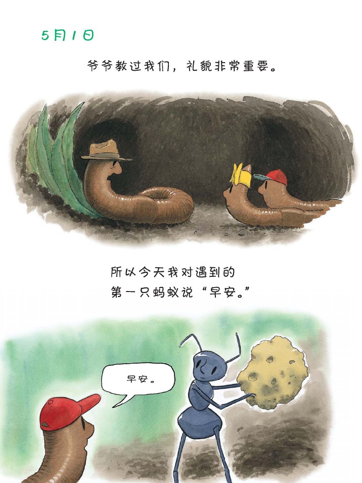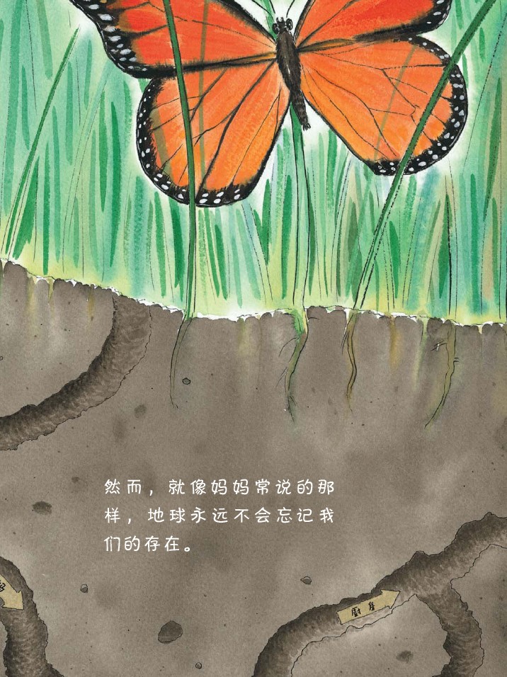 在整本图画书中,不仅是传递了一些科学知识,也是试图发展孩子对自然的情感。例如以下画面,则是提醒我们应让儿童了解蚯蚓对人类的作用,我们应保护它们。