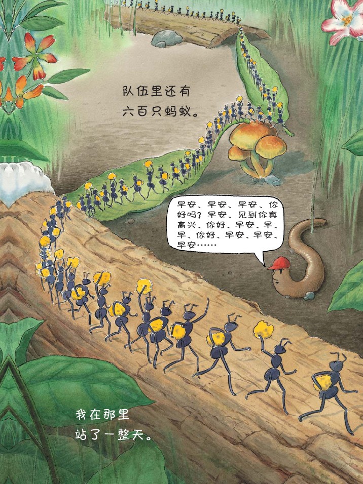 图画书中的一些画面非常幽默,在欢笑之余应关注画面所传递的内容。例如以下画面,是关于蚂蚁是群居的内容。