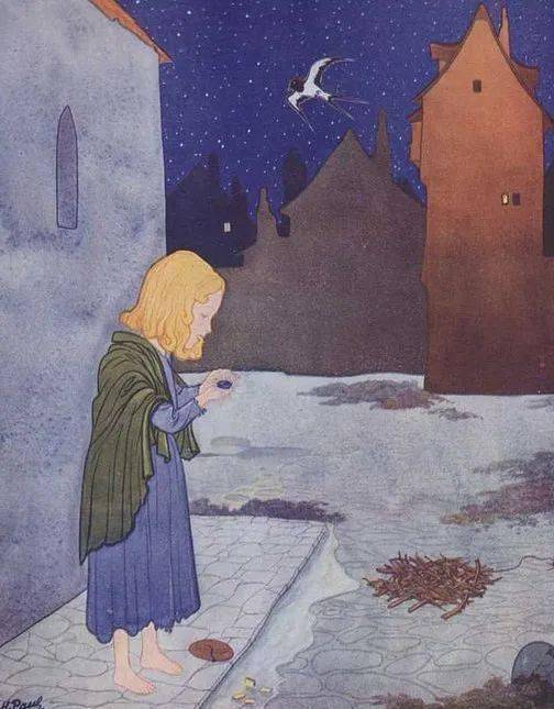 “在下面的广场上,”快乐王子说,“站着一个卖火柴的小女孩。她的火柴都掉在阴沟里了,它们都不能用了。如果她不带钱回家,她的父亲会打她的,她正在哭着呢。她既没穿鞋,也没有穿袜子,头上什么也没戴。请把我的另一只眼睛取下来,给她送去,这样她父亲就不会揍她了。”