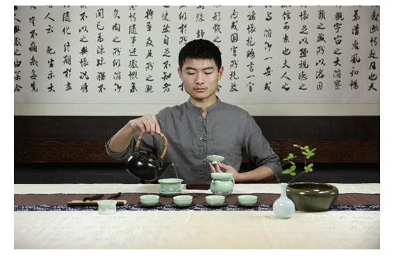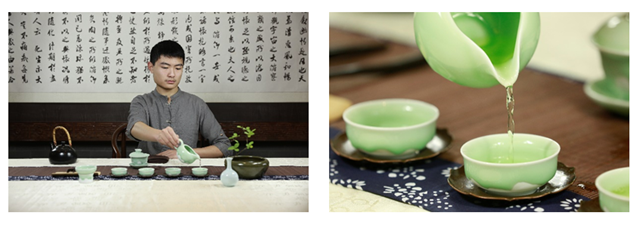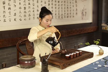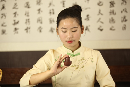 手执玉壶,春心摇动:双手轻执紫砂壶,高度于右肩膀持平,轻轻摇动3-5次,让壶中茶叶受湿热的空气温润,香气开始散发出来,达到满壶生香。